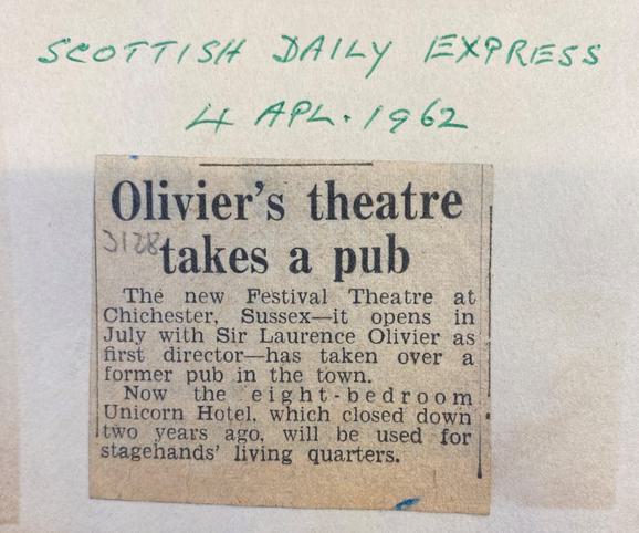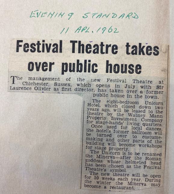 In the early years the Theatre leased the Unicorn Inn on the junction of Eastgate Square in Chichester (currently The Giggling Squid restaurant), to be used as a wardrobe and property store. It was known as Minerva Studios, and housed the costumiers and other skilled professionals working behind the scenes on productions.