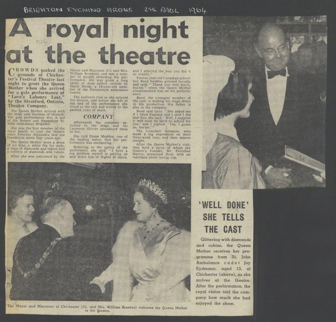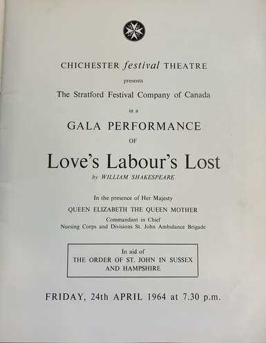 Two years later in 1964, Stratford Festival Players embarked on a $100,000 tour to Chichester with three productions: Timon of Athens, Le Bourgeois Gentilhomme and Love's Labour's Lost, the latter attended by the Queen Mother for a gala performance on 25 April. The success of the tour made international news, coinciding with Shakespeare's 400th birthday. Cast member William Hutt noted "Thank god [...] the English critics have judged us on our merits and never been patronising." Canadian Prime Minister wrote "Canada is proud of your contribution to the 400th anniversary celebrations of Shakespeare's birth."