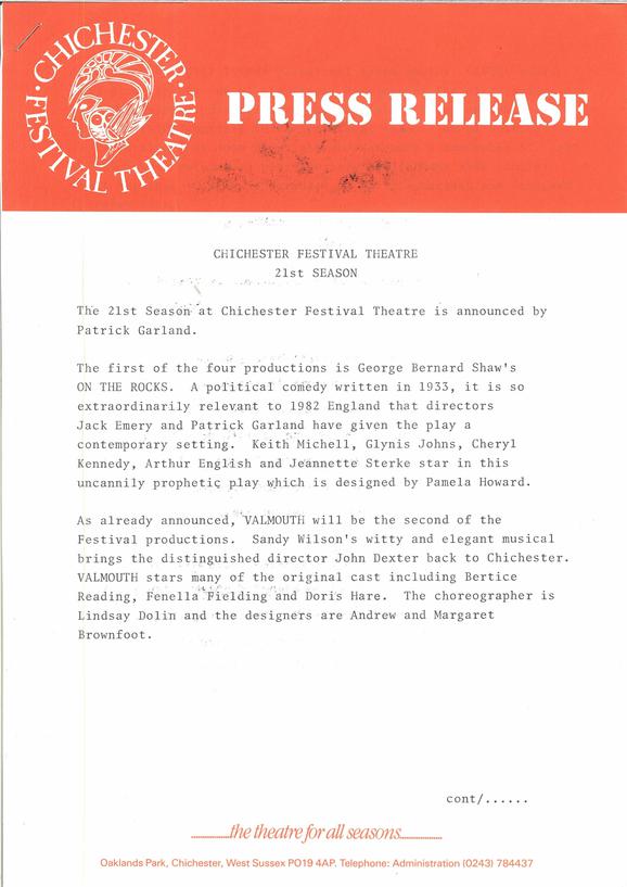 In 1982 Chichester Festival Theatre celebrated its 21st season with a number of events alongside the Festival season including a special gala concert with Princess Grace of Monaco (Grace Kelly) on 16 March.