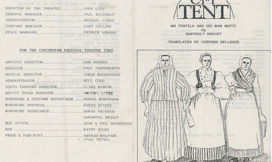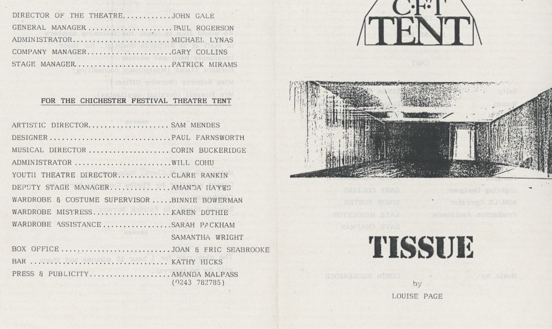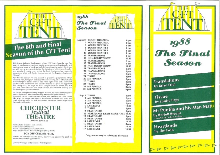 In 1983 Chichester Festival Theatre had created a temporary studio space to hold a summer festival of performances, called ‘The CFT Tent’ or ‘The Tent’ - a huge yellow and white marquee opposite the Theatre. The project was an evolution of Keith Michell's New Ventures project, which had become too scattered at venues across the city