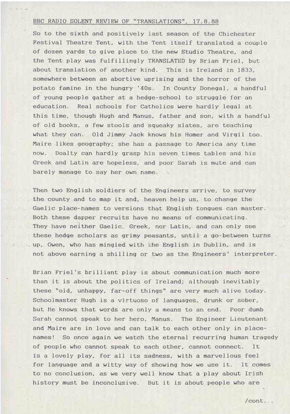 BBC Radio Solent review of Brian Friel's Translations, 1988 in The Tent
