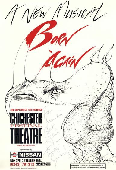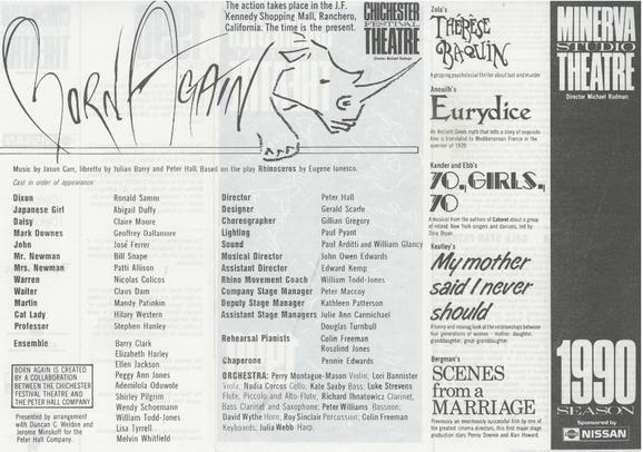 The final production of Michael Rudman's short-lived tenure as Artistic Director was the world premiere of Born Again, a musical adaptation of Ionesco's Rhinoceros, directed by theatre legend Sir Peter Hall with music by Jason Carr (the first of many musicals Carr composed at CFT).