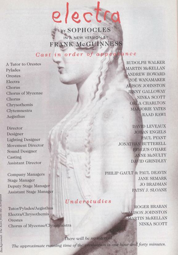 Electra, starring Zoë Wanamaker and directed by David Leveaux, was a co-production with Donmar Warehouse. By this time, the Minerva had a reputation for attracting star performers who liked the challenge of the intimate thrust stage, an interest which needed to be balanced with the potential loss of ticket sales in the smaller venue. Luckily, for Electra, this wasn't an issue for Artistic Director Duncan Weldon, who stated: 'Electra at Chichester? We'd empty the bloody theatre. They're not going to come and see Greek tragedy in the Main House. Keith Michell did Oedipus Tyrannus back in 1974 and it was empty, even with Keith in it [...] If we do Electra, it has to be in the Minerva'.