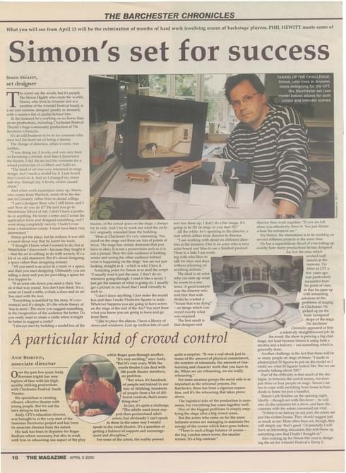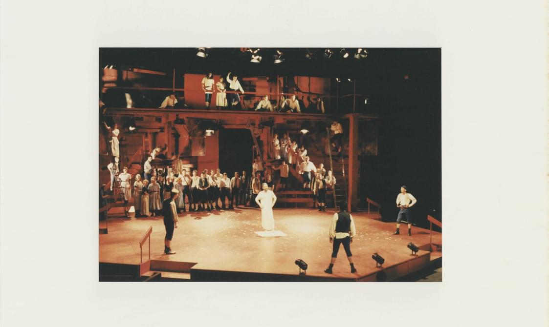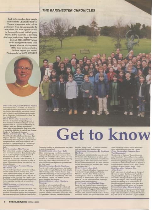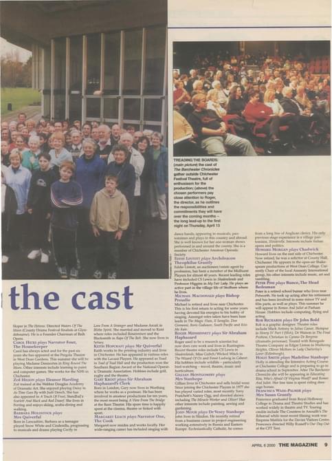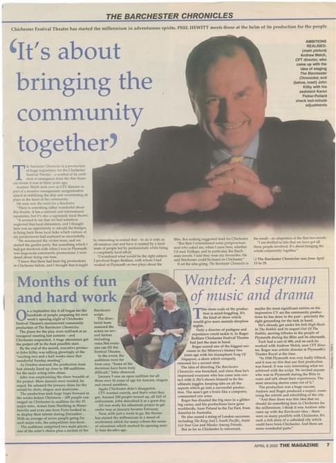The Millennium season opened with a community production of The Barchester Chronicles, requiring a huge involvement from local people in Chichester and the surrounding areas. Hundreds offered their services - singing, building, painting, leafleting, sewing - even the lead roles were taken by local amateurs. The production evoked memories of CFT's other community productions, whose epic undertakings reinforced the Theatre's connection with the local community, so crucial from its conception. These included: