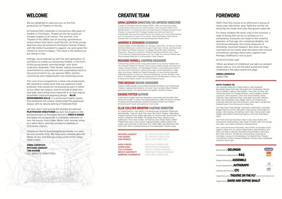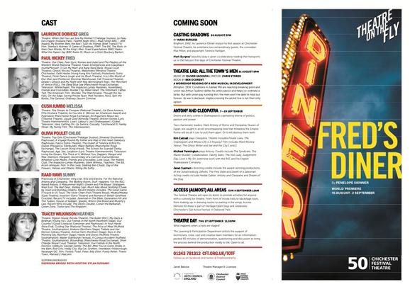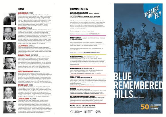 Harking back to the days of The Tent in the 1980s, the venue was to house a nine-week season by CFT's three apprentice directors: Tim Hoare, Anna Ledwich and Michael Oakley. The season included three main productions - Patrick Marber's Blue Remembered Hills, April de Angelis's Playhouse Creatures and Penelope Skinner's Fred's Diner - alongside a range of events including rehearsed readings, CFYT productions, concerts and even a silent disco!