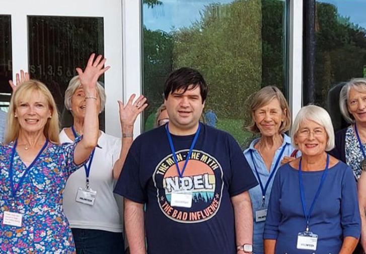 12. A bearded male wheelchair user, accompanied by a woman wearing a pink scarf, smile as they receive a ticket from a cheerful Box Office assistant