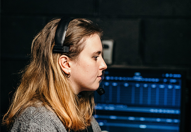 10. Zoe is sitting in a darkened sound booth with her face lit from below by the lights on the control panel. She has a beaming smile on her face as she looks towards the camera.