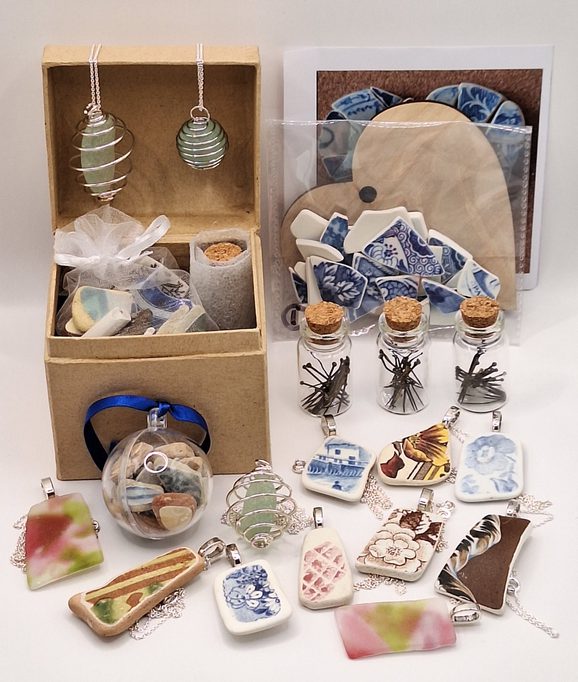 - Pottery & sea-glass pendants on sterling silver chains; Mosaic heart kits; and Small bottles with handmade pins (14th–18th centuries)